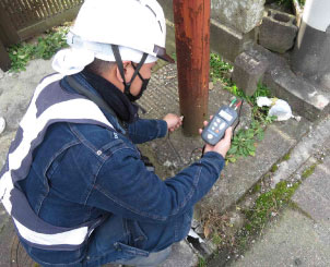 リバウンドハンマーを使用し、コンクリートに打撃を加え、はね返ってきた衝撃の強さを測定することでコンクリートの圧縮強度を調査します。