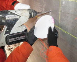 ドリルにより削孔、落下した削孔粉をフェノールフタレイン溶液をしみ込ませたろ紙に受け紅色に変色したとき、直ちに削孔を停止し、孔の深さを測定します。
